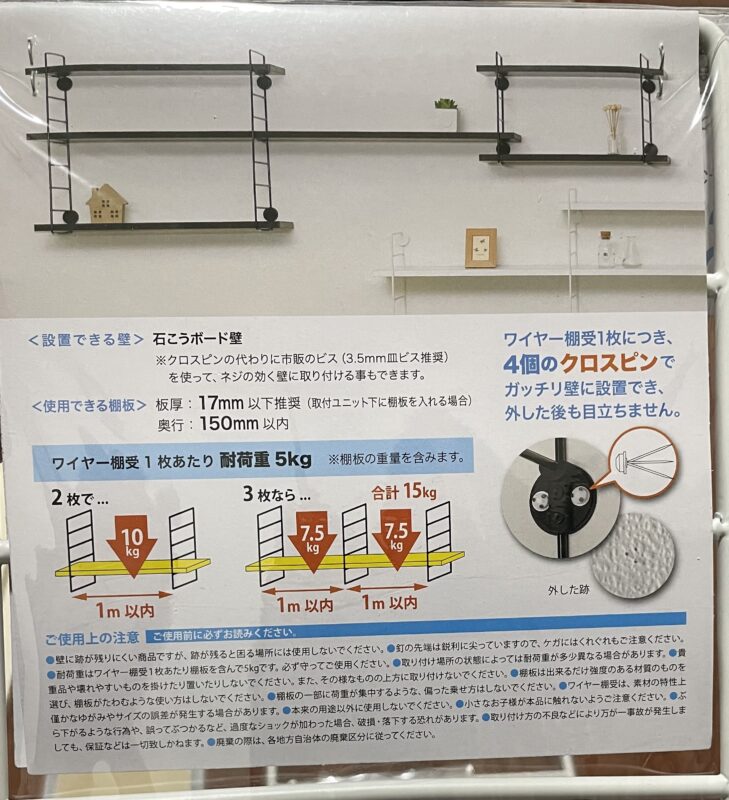 今回紹介したワイヤーシェルフ ショートはワイヤー1枚あたりの耐荷重は5kgとなっています。